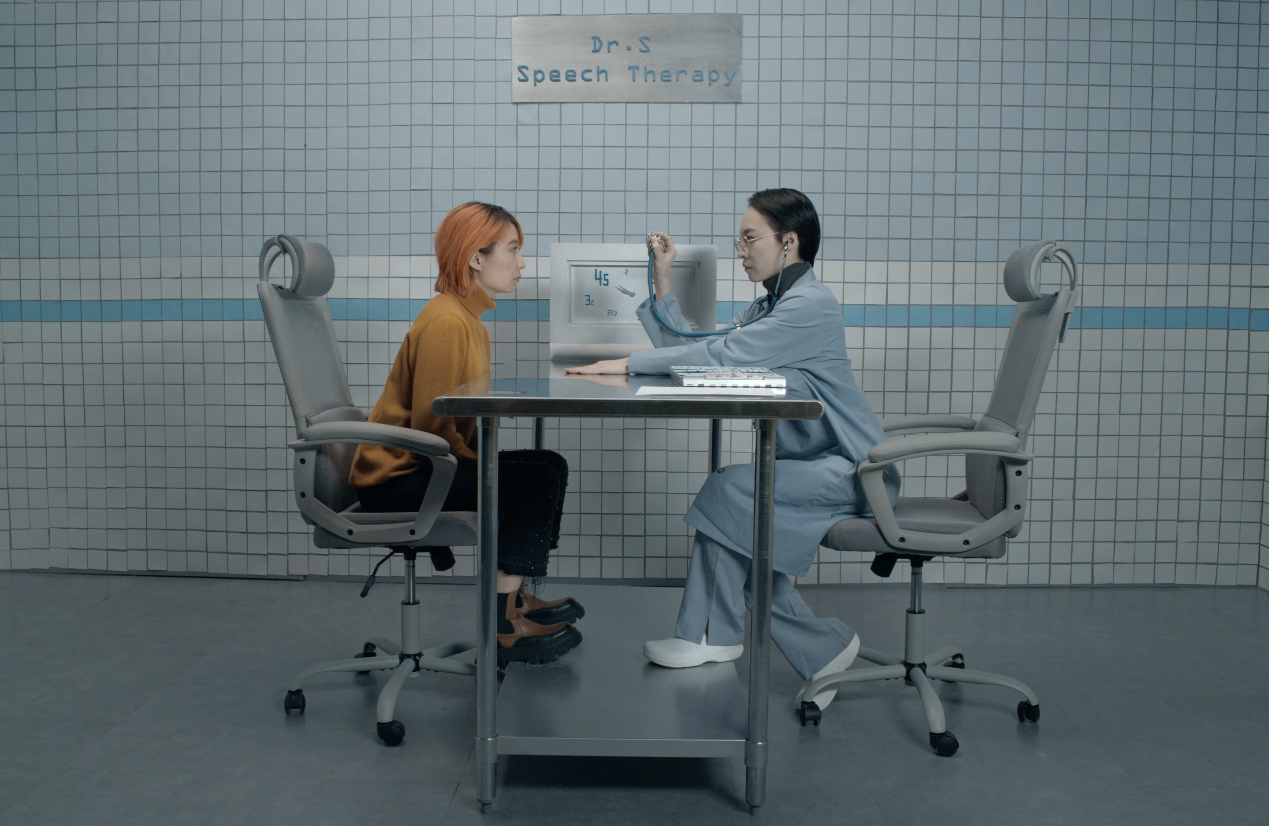 An individual in her late 20s of the Chinese diaspora finds herself purposeless in a cold, monumental urban landscape. Upon an uncanny encounter with a white box, she is pulled into a surreal speech therapy room, where a stern therapist of her age and ethnicity diagnoses her with aphasia, speech impotence. Being asked to perform absurd tasks, the protagonist regains agency and re-examines her relationship with the city. As a result, the speech therapist fails at the assimilation task as the protagonist reconnects with her interiority.